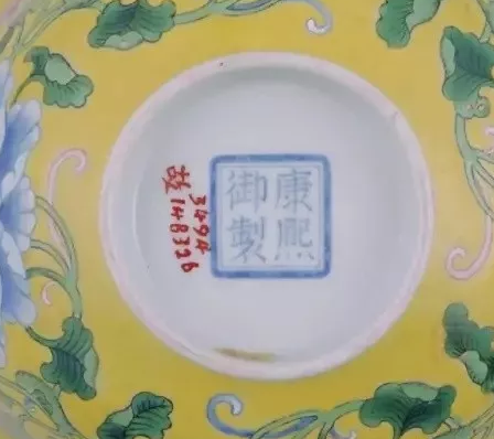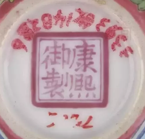 外底虽也署“康熙御制”四字双行红色堆料款,但外围的不是双方框,而且双线圆圈,圈线外粗内细。至于康熙朝宜兴胎画珐琅器外底所署款识,一般为“康熙御制”四字双行黄色堆料款,外围双线方框,个别的如台北故宫博物馆收藏的宜兴胎画珐琅四季花纹茶壶,外底所署黄色堆料款“康熙御制”四字作“上下左右”排列,