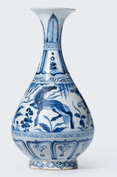 明代的玉壶春瓶在造型上和工艺上更加成熟。明代玉壶春瓶早期多见施釉素器,暗花器、釉里红器以及青花器,中期、晚期以青花器最为常见。在装饰纹样上,常常以云龙、梅、兰、花鸟、缠枝莲等为内容。龙的题材宫廷御用的品种,一般人是无法使用的,而文人们更容易对梅、兰等品德寓意的题材引起共鸣。