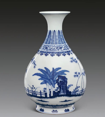 清代是玉壶春瓶演化过程中一个重要的时间点,清代玉壶春瓶的烧制釉色品类众多,各种单色釉、粉彩、斗彩、青花皆可烧制。从纹饰内容上看,清代玉壶春瓶很大程度上与明代装饰风格有了明显区别,纹饰题材更趋于丰富多样,所绘内容不仅涉及文人士大夫阶层,也有体现世俗生活之美的作品。特别是以竹石芭蕉为主题纹饰的青花玉壶春瓶十分流行,从乾隆时期到清末都有烧造。